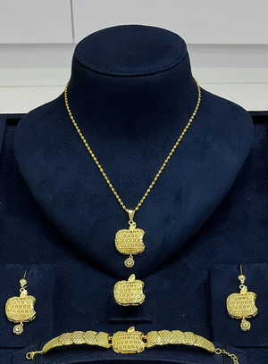 This elegant gold apple pendant necklace set features a unique and stylish apple-shaped design that symbolizes charm and sophistication. Crafted with a textured gold-tone finish, the set includes a matching necklace, earrings, and bracelet, making it a perfect choice for women who love modern yet classy jewelry. Ideal for daily wear as well as special occasions, this set adds a subtle statement to any outfit.