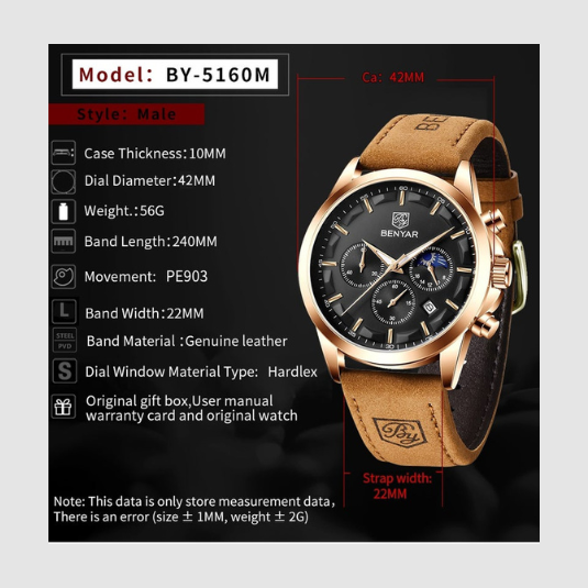 - 【⌚The Chronograph Watch】BY BENYAR offers a range of classic designer wrist watches specially crafted for men. The watch combines multifunction dial and a built-in date calendar feature that displays the date, suit for daily use.